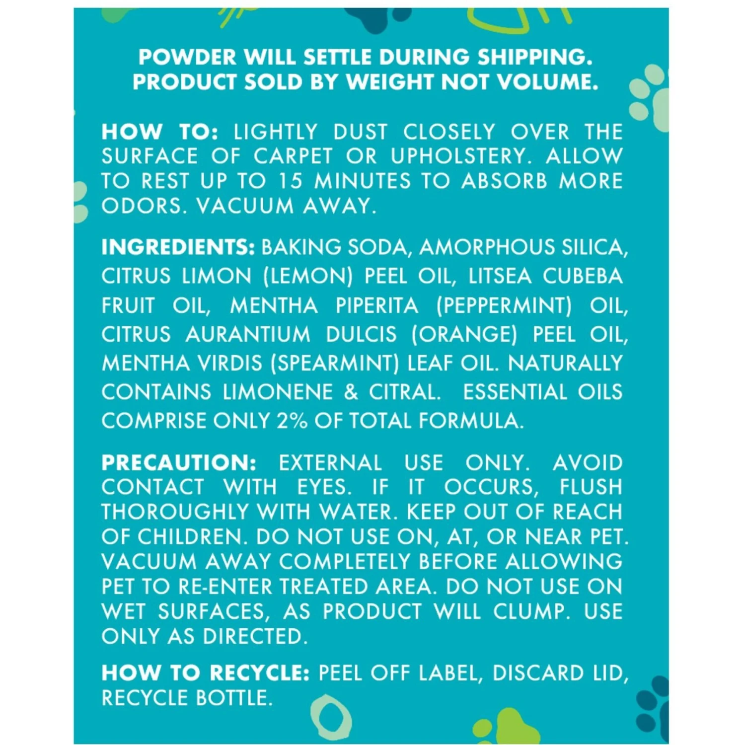Remove the safety seal under the cap. Flip open the cap and lightly dust over the surface where pet odors may linger. Aunt Fannie’s Carpet Refresher is great for use on carpets, rugs, mattresses, cat beds, and even upholstery. Allow to rest up to 15 minutes to absorb odors then vacuum away. Please use on dry surfaces only. This product is not recommended for absorbing moisture, as it may clump and cause vacuum challenges. Do not use on, at, or near a pet. Vacuum away completely before allowing pet to re-enter treated area.