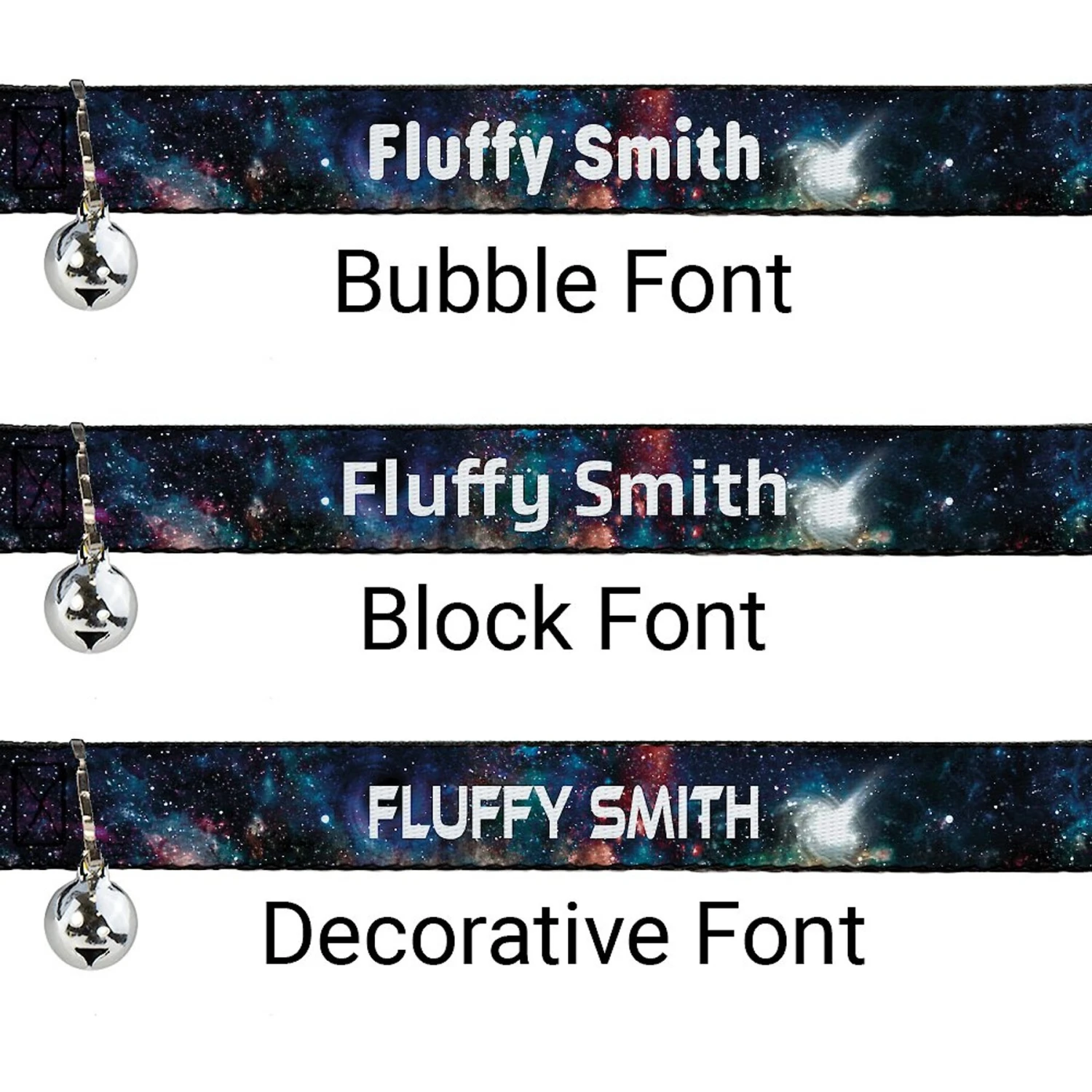 Keep your mini mate safe with the Buckle-Down Personalized Breakaway Cat Collar with Bell. This breakaway collar for cats features bold and vibrant original artwork and can be personalized with printed text just for your pal. It is handcrafted in the USA with high-density polyester that’s designed for long-lasting durability. This breakaway cat collar is equipped with an over-engineered plastic buckle and a super-strong D-ring to keep your sidekick secure.