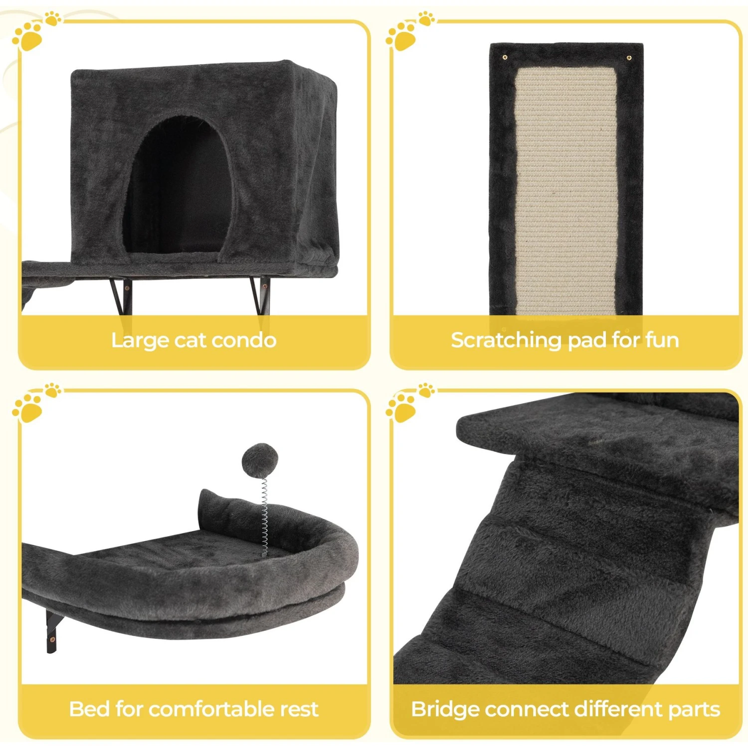 Spark your cat’s natural sense of curiosity and adventure with Coziwow Wall Mounted Cat Shelves! This premium six-piece set provides a purr-ivate playground for your feline companion to stay active and healthy. Each tree includes a cozy house, a thrilling bridge, one sturdy scratching board, sisal rope posts and a playful jumping platform. With a wall-mounted design, this cat tree set maximizes your space and is perfect for corner spaces, hallways and doorways. As an added bonus, a complimentary pouch of catnip is included to entice your furry friend!