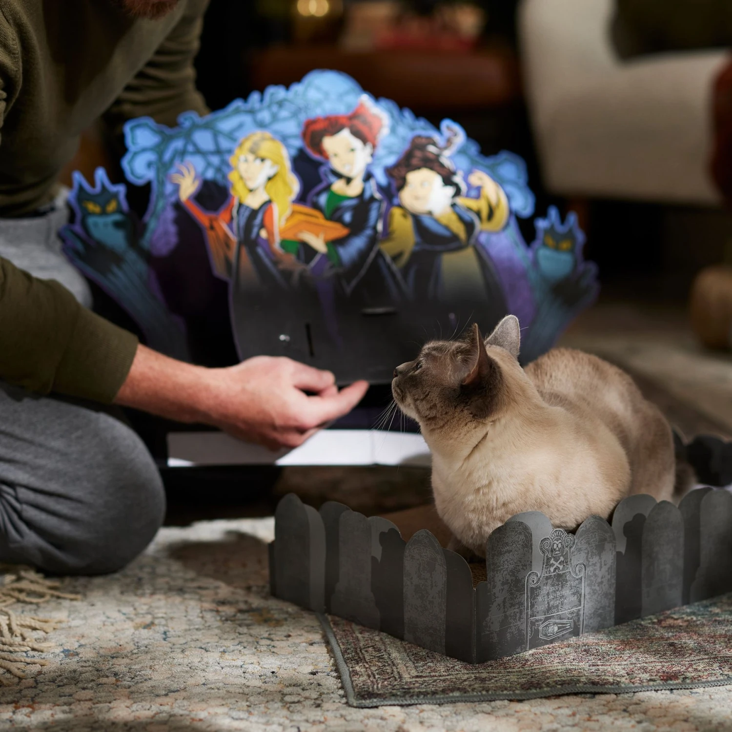 Lure your cat in for a scratching good time with this Disney Halloween Hocus Pocus scratcher toy, available only at Chewy. Featuring The Sanderson Sisters gathered around a graveyard to beckon kitty to their doom—of fun, of course! Scratch and stretch, and eye of newt! The corrugated cardboard base is perfect for helping kitty keep those claws snappy, and it’s wide enough for a little cat yoga, while they’re at it.