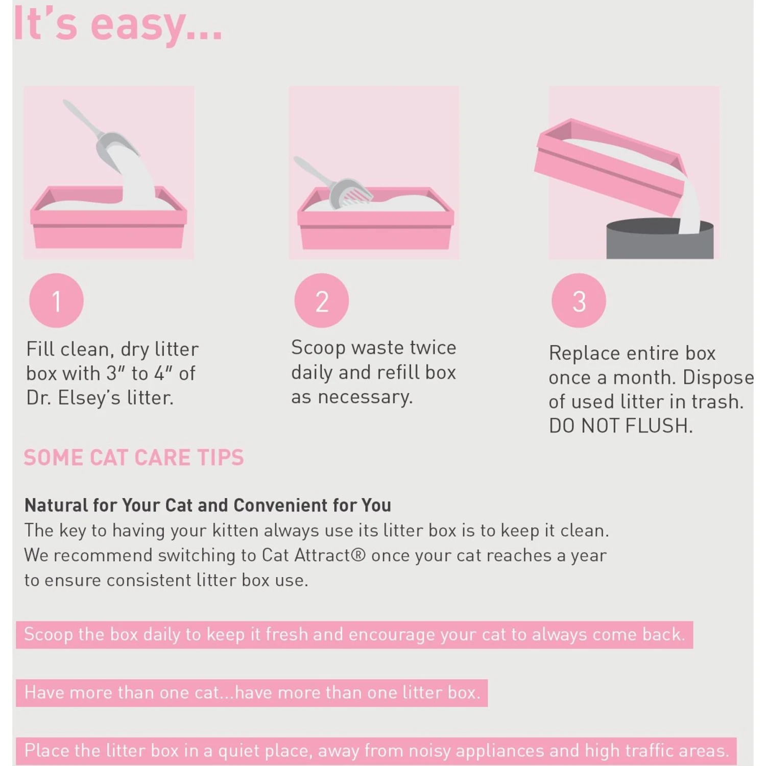 - Fill clean, dry litter with 3-4 inches of Dr. Elsey’s litter. This depth allows your cats to dig and cover their waste naturally.