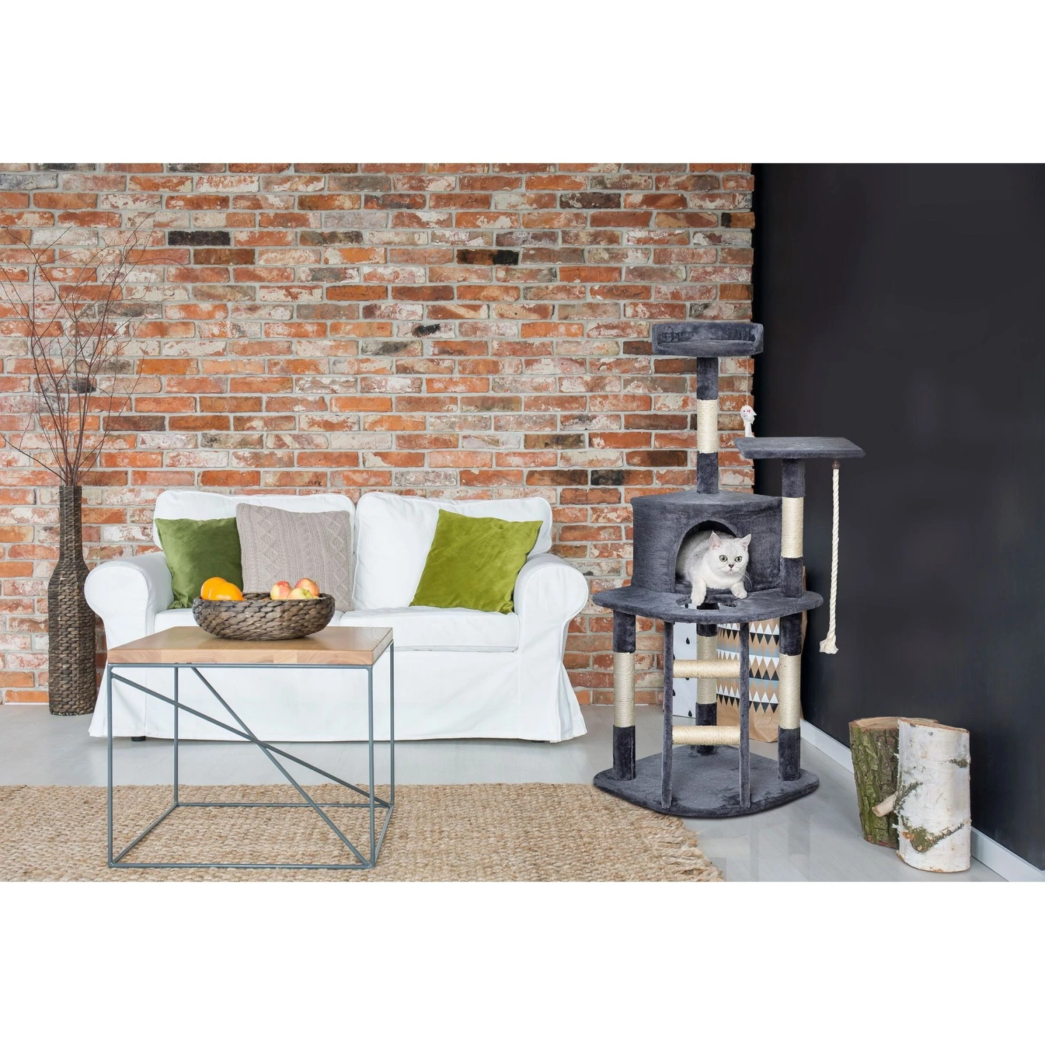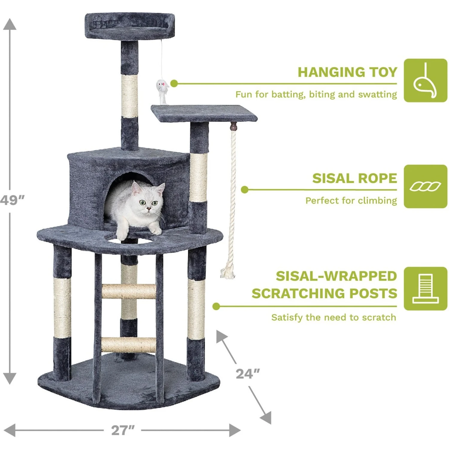 Expect nothing but love and purrs after gifting your feline friend the Go Pet Club 49-in Economical Cat Tree Condo & Sisal Covered Posts. This tree is furnished in a soft faux-fur finish to provide your cat with ideal comfort when she sleeps, snuggles and relaxes. The center condo offers the privacy your kitty craves when she deserves a break from the distractions of home. One perching platform and a raised bed provide her with the elevation she needs to keep an eye on the room, while the sisal rope surfaces encourage her love of scratching. The dangly rope and toy mouse engage her natural hunting instincts so her mind stays active and ready to pounce!