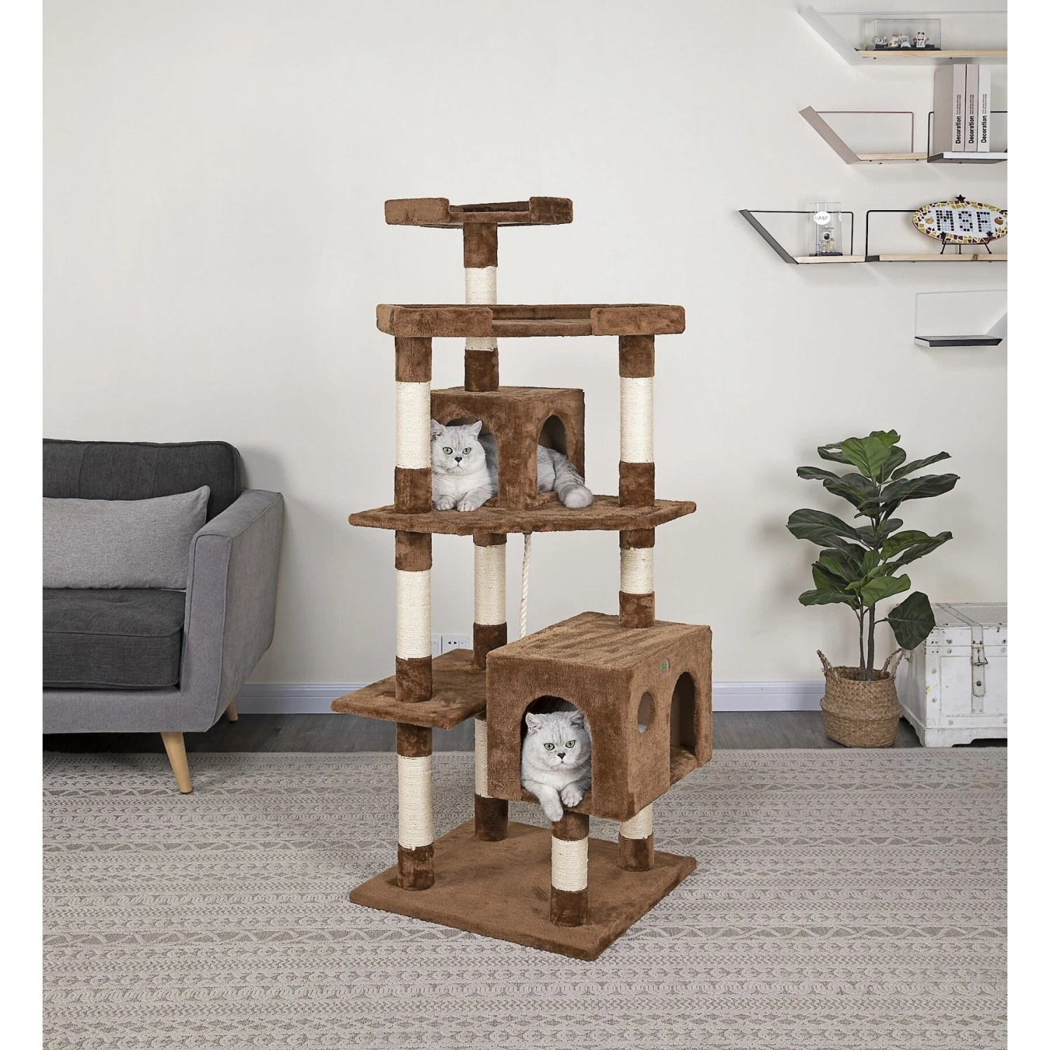 Your feline friend will be eager to explore his Go Pet Club 60-in Sisal Scratching Posts Cat Tree. This tree is furnished in a faux-fur interior and exterior so your cat stays cozy and warm as he relaxes. The bottom level condo offers a quiet escape when your best bud is in need of some undisturbed rest, while the middle condo still provides privacy but encourages your boy to be a bit more social. Elevated platforms allow for perching and observation and the hanging toy rope engages his natural love for swatting and batting. You can worry less about claws ruining your furniture with the sisal rope-wrapped posts that are made for safe scratching.