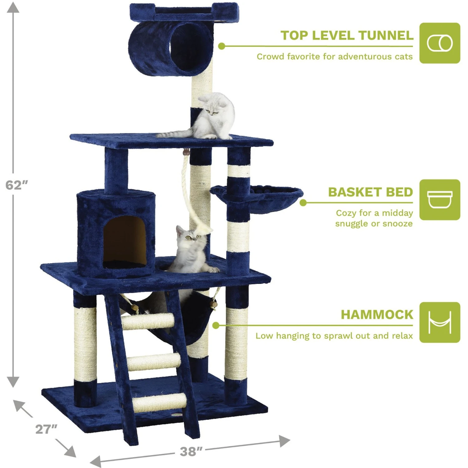 Give your feline friend a cozy place to chill or have fun with the Go Pet Club 62-inch Cat Tree. The cat tree is covered with natural sisal rope to keep your kitty from clawing your furniture. This tiered tree includes 1 hanging rope for your pal to play with, a ladder so he can climb up and down, a basket for him to relax in and multiple levels and perches for your cat to enjoy. A great way to promote exercise, your furry friend will have plenty of ways to stay active, plus your shy cat will have a safe place to hide out or to simply relax. Plus, it’s easy to assemble with step-by-step instructions and tools included.
