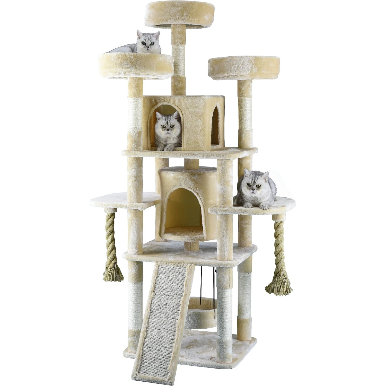 - Features large ropes, a swinging bed, sisal scratching posts, 2 cat condos and more.