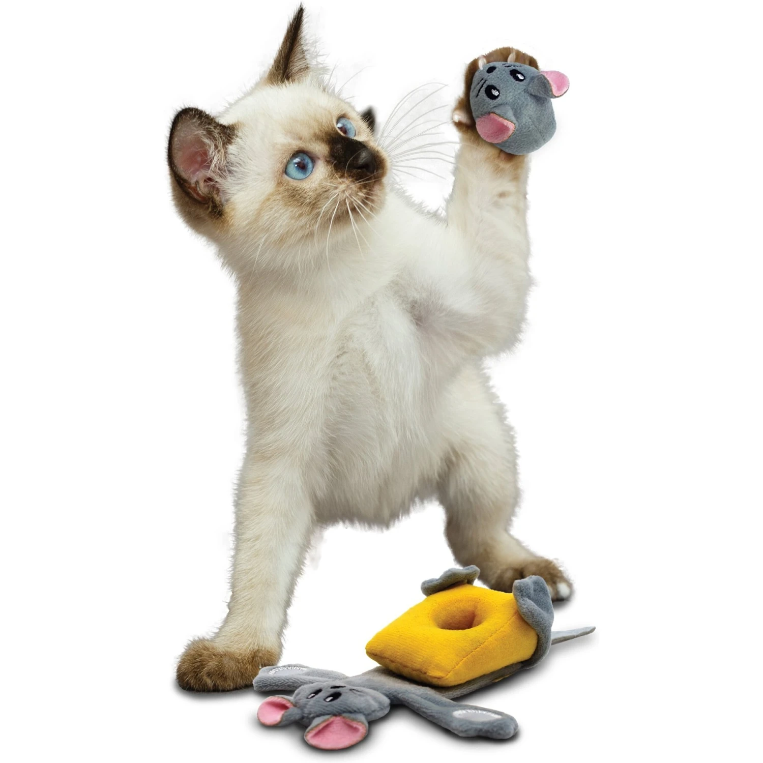 Show your kitty that everything is better with cheddar with her new KONG Pull-A-Partz Cheezy Cat Toy. This unique and interactive cat toy is actually three toys in one, with grippable patches that allow your cat to dismantle it again and again. The large mouse is designed with long arms and legs that are purr-fect for wrestling. The cheese is detachable for wheeling around the house and the little mouse pops out of his cheesy home. This fun toy is also packed with premium catnip to help keep your furry friend actively engaged at playtime.