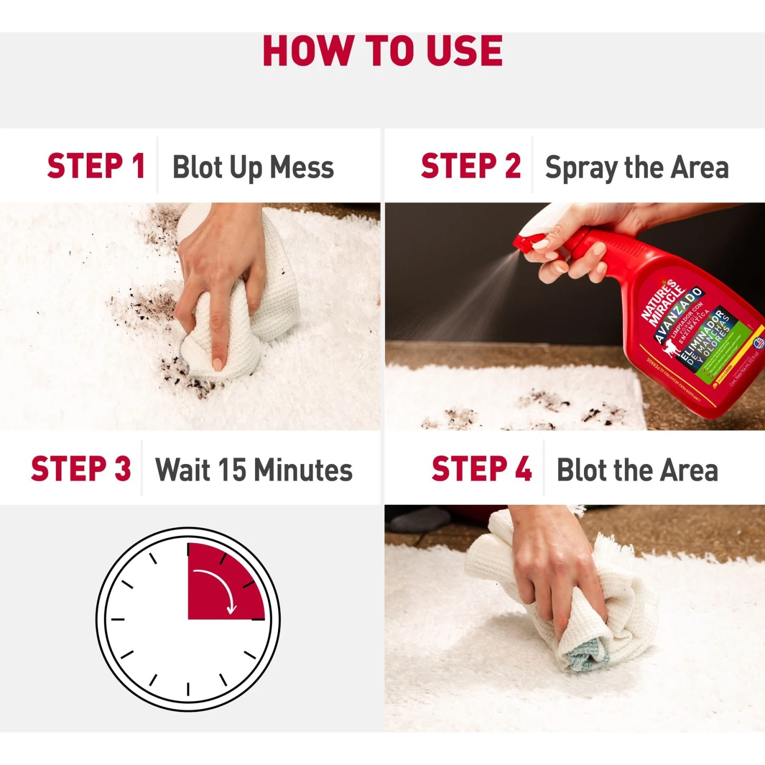 Before using, test surfaces to be treated for colorfastness by applying to a hidden area. Wait 5 minutes, then wipe with white cloth. If color is removed from the test area, do not use Nature’s Miracle Advanced Stain & Odor Eliminator on those surfaces. Do not use on untreated hardwood, leather, suede, silk or wool, specialty fabrics. Always use this product at full strength. Do not dilute. Always use Nature’s Miracle Advanced Stain & Odor Eliminator products first. Other cleaners and detergents may fail and chemically “set” stains that will be impossible to remove.