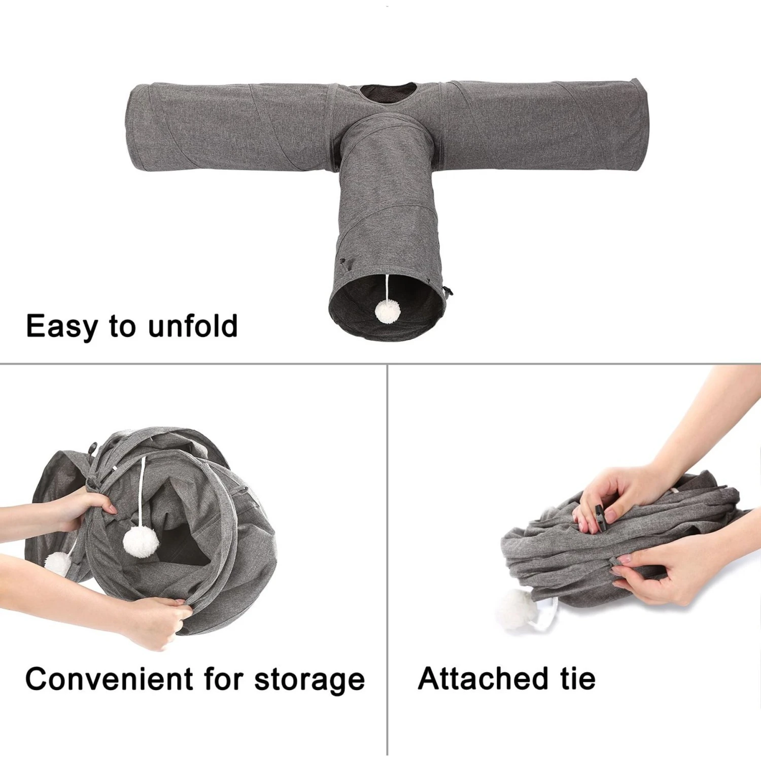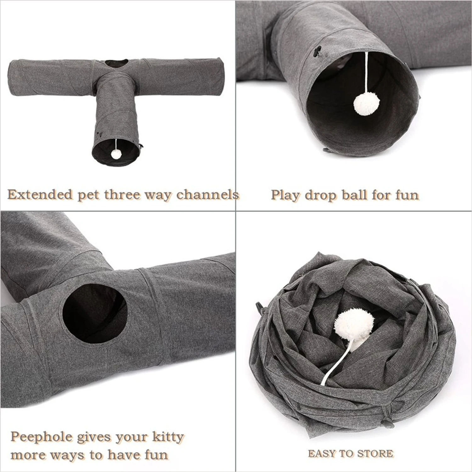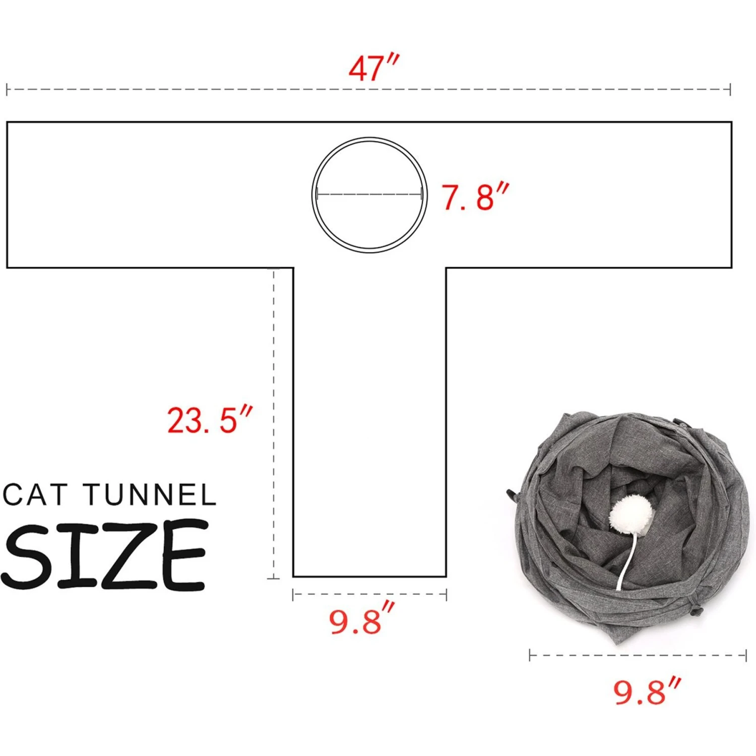 Give your feline fur-iend the purr-fect place to hide with the Ownpets T Shape Tunnel Cat Toy! This stylish tunnel is made from durable, oxford fabric in a neutral gray color, and its collapsible design allows you to use it at home or on-the-go. It features a three-way tunnel design, peep holes, a drop ball in the middle of the channel and an additional feather wand for increased interaction. It’s also suitable for puppies, rabbits, weasels, marmots and other small pets. This multifaceted toy is sure to provide plenty of play paw-sibilities for you and your purring pal!