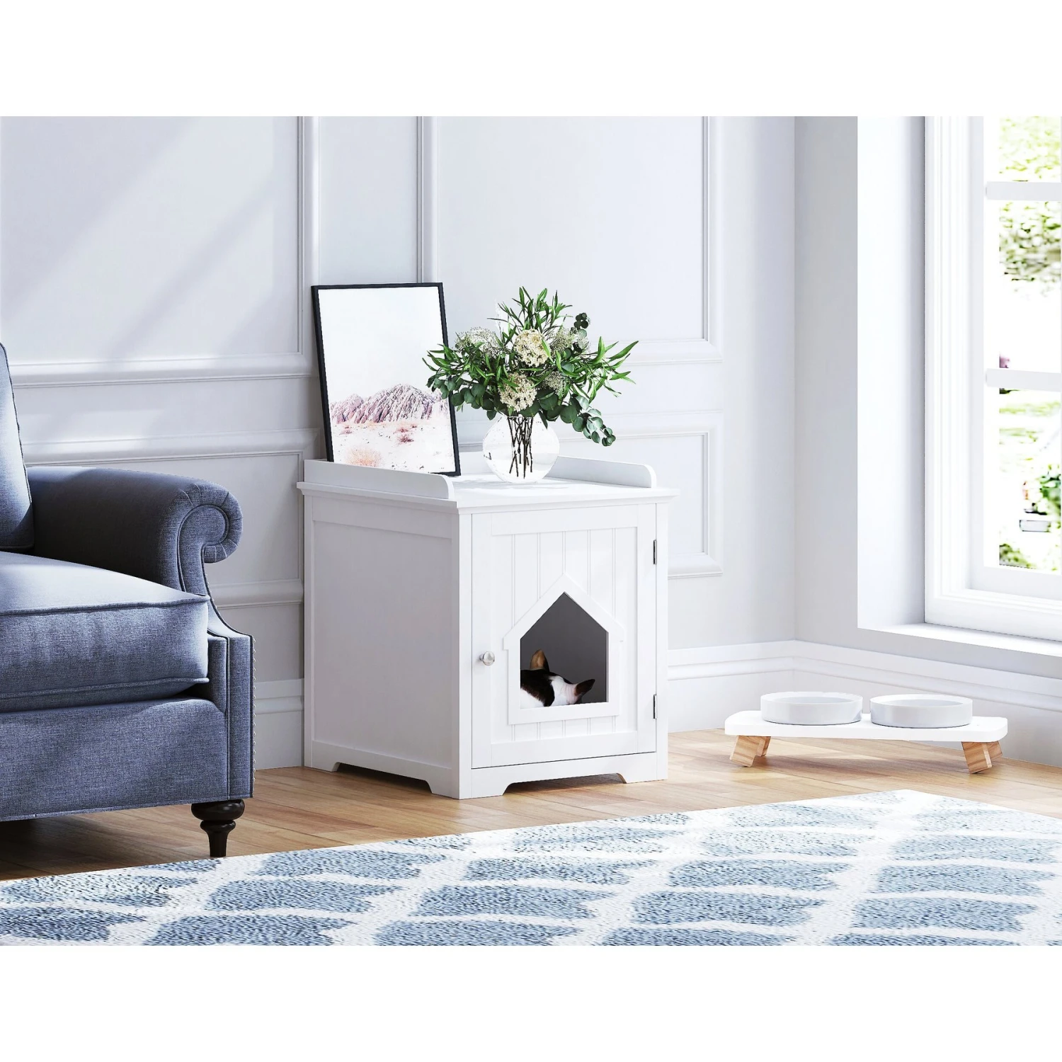 - The wide, flat top is paw-fect for storing tabletop items like lamps, picture frames, or other household objects.