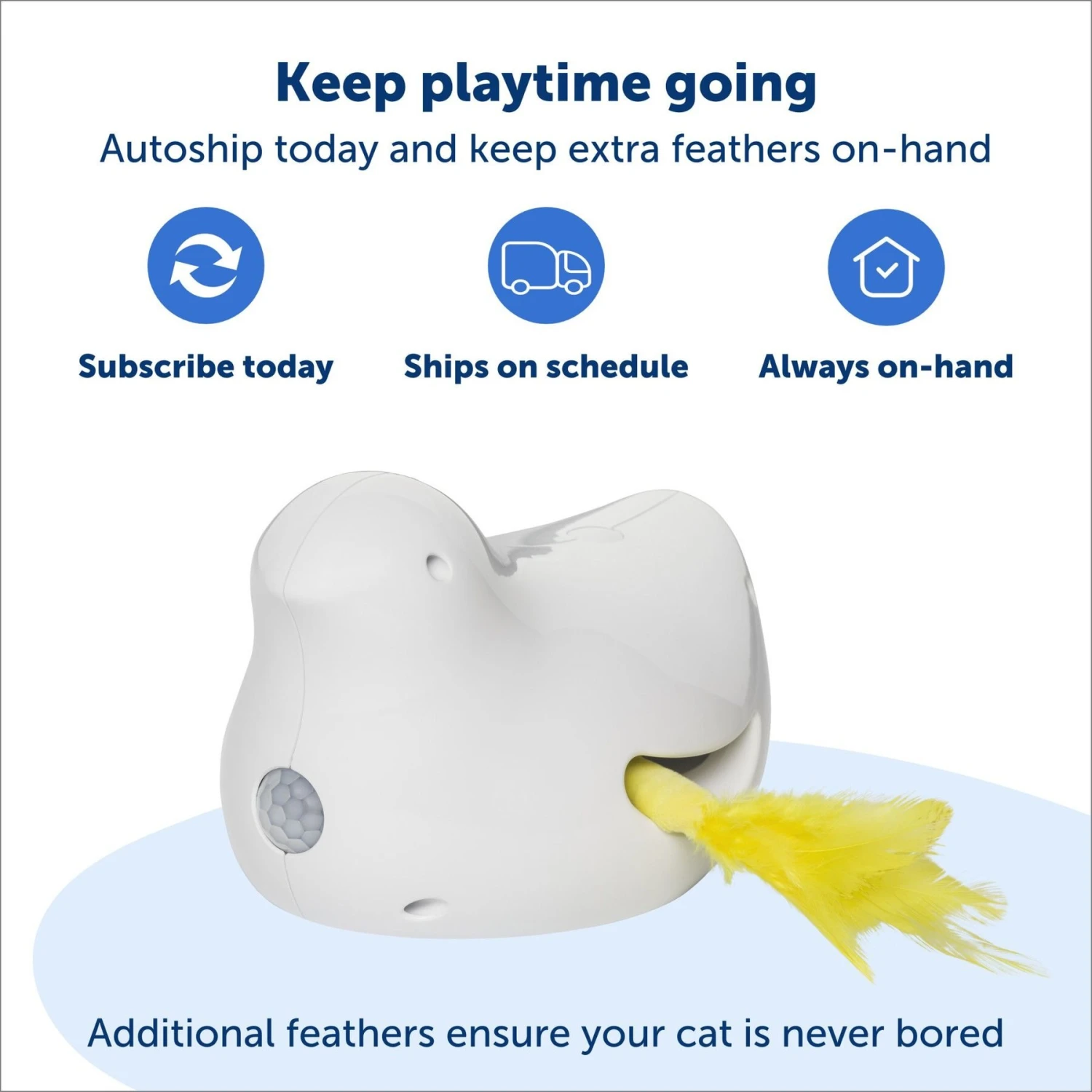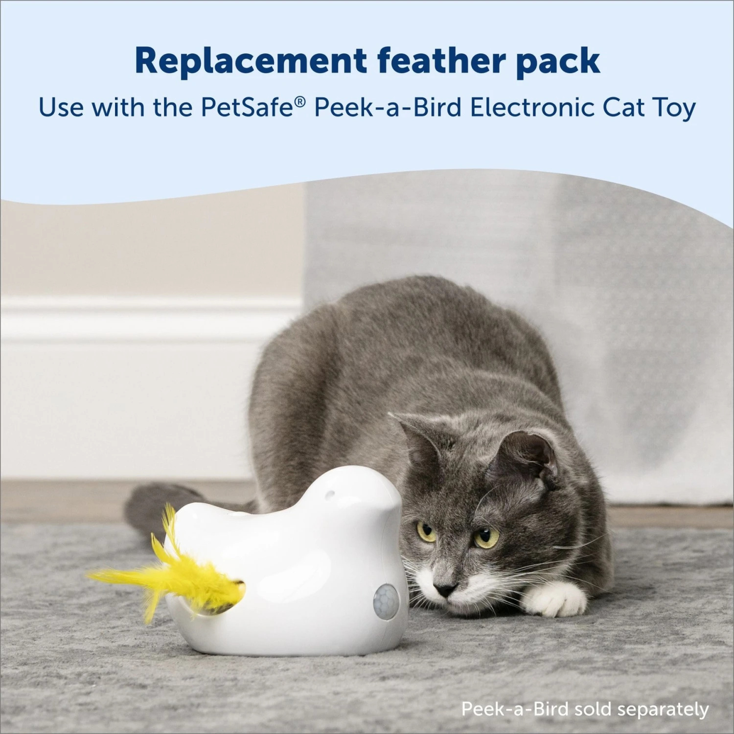 Give your kitty the purr-fect playtime toy! The PetSafe Peek-A-Bird Replacement Feather Cat Toy is designed with interactive play in mind. It features two bright yellow replacement feathers to add a little extra flair to your Peek-a-Bird Electronic Cat Toy (sold separately). The feathers are designed to flutter on and out of two different openings. This fun toy addition is sure to keep your feline fur-iend’s curiosity strong and her energy high as she shows you her best mew-vs!