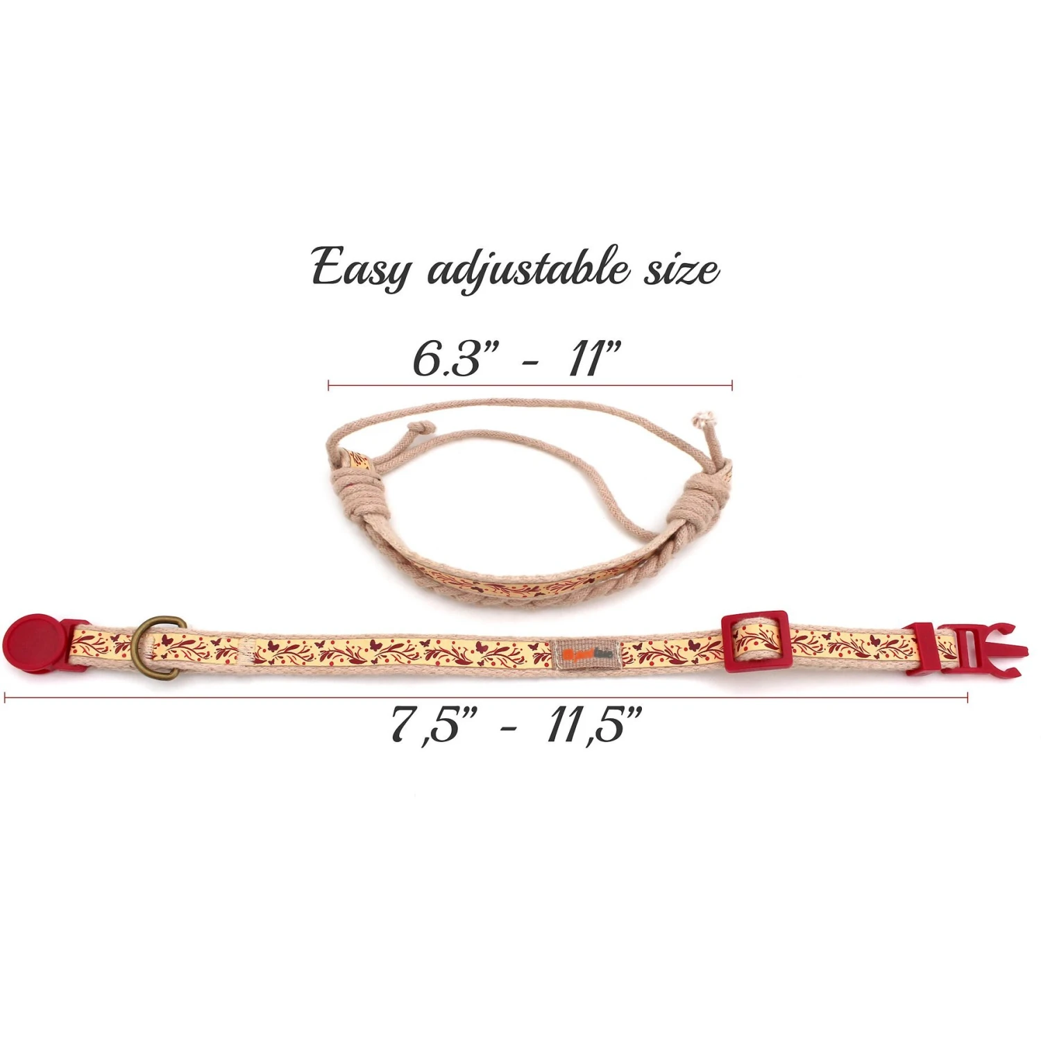 - Charming design and color scheme makes cat collar uniquely stylish, and it’s also fully adjustable from 7.5 to 11.5 inches.