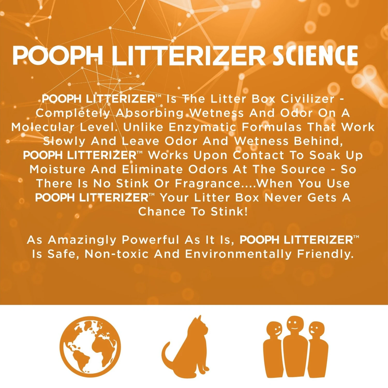 Love your kitty but can’t stand the smell of her litter box? POOPH Kitty Litter Box Saver Cat Deodorizer is here to save your nose, your time and your wallet. This powerfully absorbent powder additive is designed with a proprietary odor molecule dismantling technology, so all you have to do is sprinkle it into the litter box before your cat goes and let POOPH do the work!