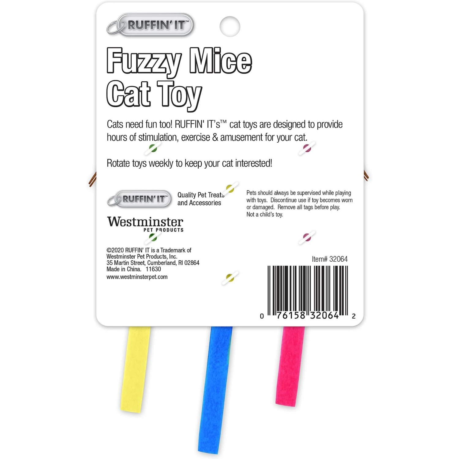 The hunt is on with the RUFFIN’ IT Fuzzy Mice Assorted Cat Toy! This pack of mice features playful colors and fuzzy material to help capture your kitty’s attention. Great for solo play and fetch alike—every chomp, bat and chase helps satisfy your cat’s natural urge to hunt—and provides hours of a-mews-ment!