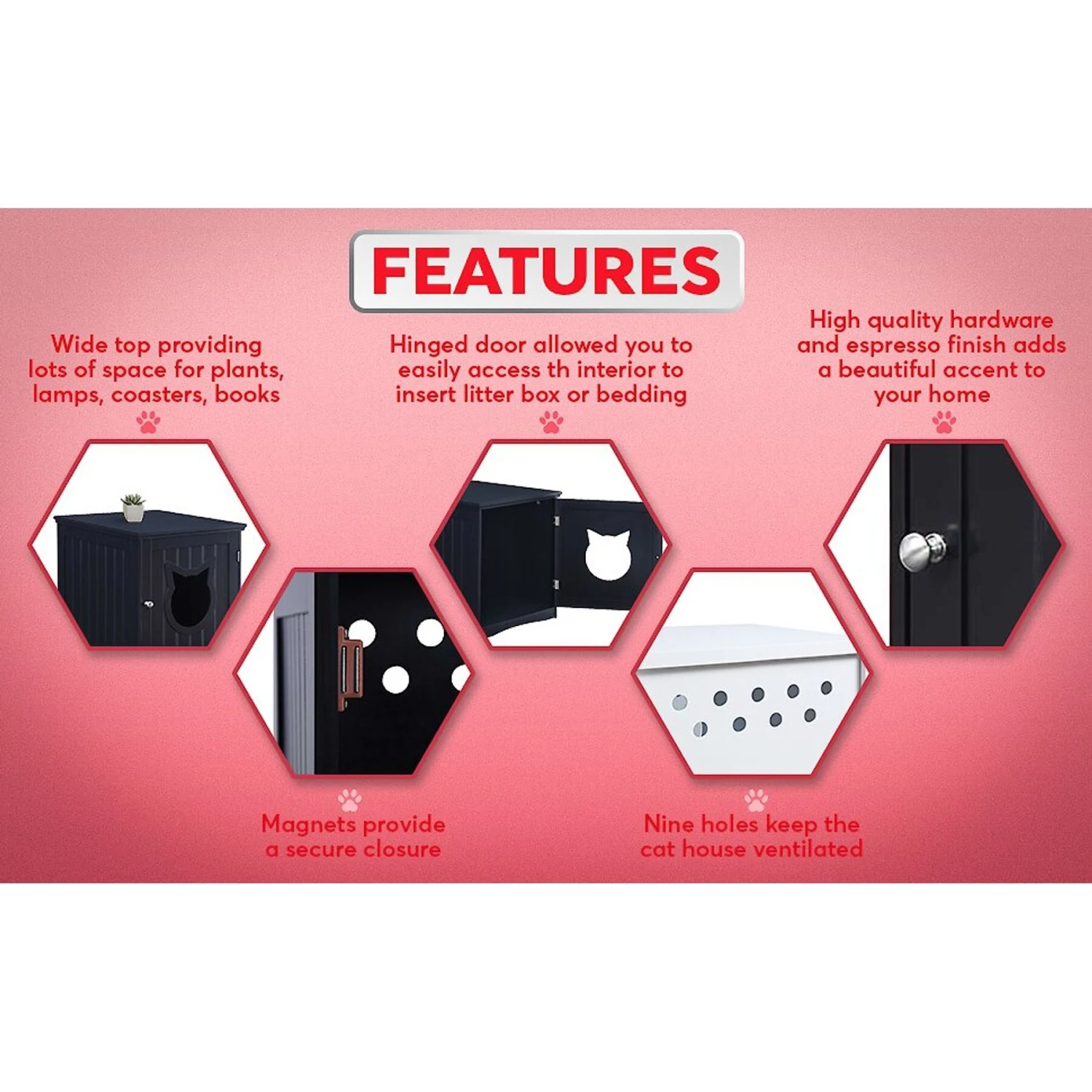 - Multifunctional cat litter box enclosure doubles as a stylish furniture piece in your home.