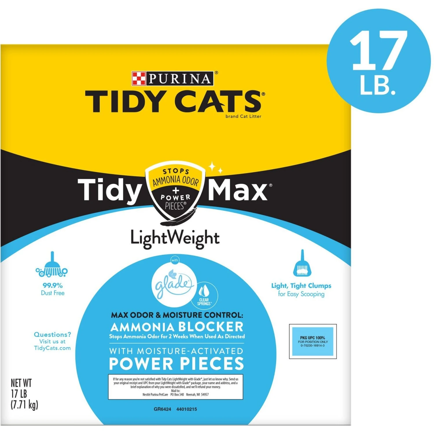 Put two trusted names to work in your kitty’s litter box with Purina Tidy Cats Tidy Max LightWeight With Glade Clear Springs Clumping Litter. TidyLock technology take the fight to urine and fecal odors, while Glade Clear Springs scent leaves behind a fresh fragrance. With a one-two punch against strong odors, this dual-powered odor control cat litter helps you keep up a clean-smelling home. Plus, Tidy Max Ammonia Blocker blocks ammonia odor for up to two weeks to stay on top of odors. This advanced clumping cat litter locks in moisture, too, forming strong, tight clumps for easy scooping. Even better, the lightweight litter is half the weight of the leading clumping kitty litter. Great for multiple cats, it stands up to daily use by your feline friends. This recyclable box has a leak-proof bag inside, helping keep everything nice and dry during shipping. Just pull open the perforated bag top, pour in the low dust cat litter and get back to spending time with your furry friends.