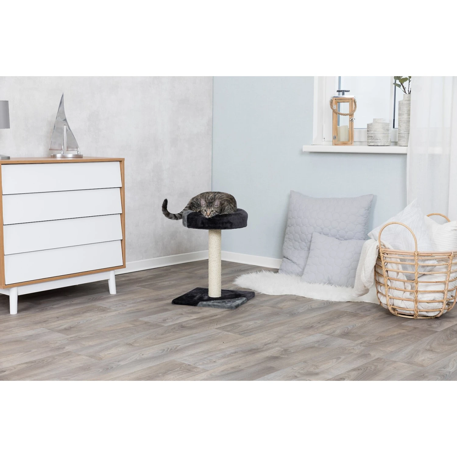 TRIXIE’s Tarifa 20.5-in Plush Cat Scratching Post is made for compact spaces for your pint-sized sidekick! Furnished in a natural sisal material, this post is purr-fect for encouraging your cat’s instinctual scratching habit, preventing her from clawing at other household items. The padded base can be used for resting and relaxing while the hanging pom-pom toys make for stimulating fun!