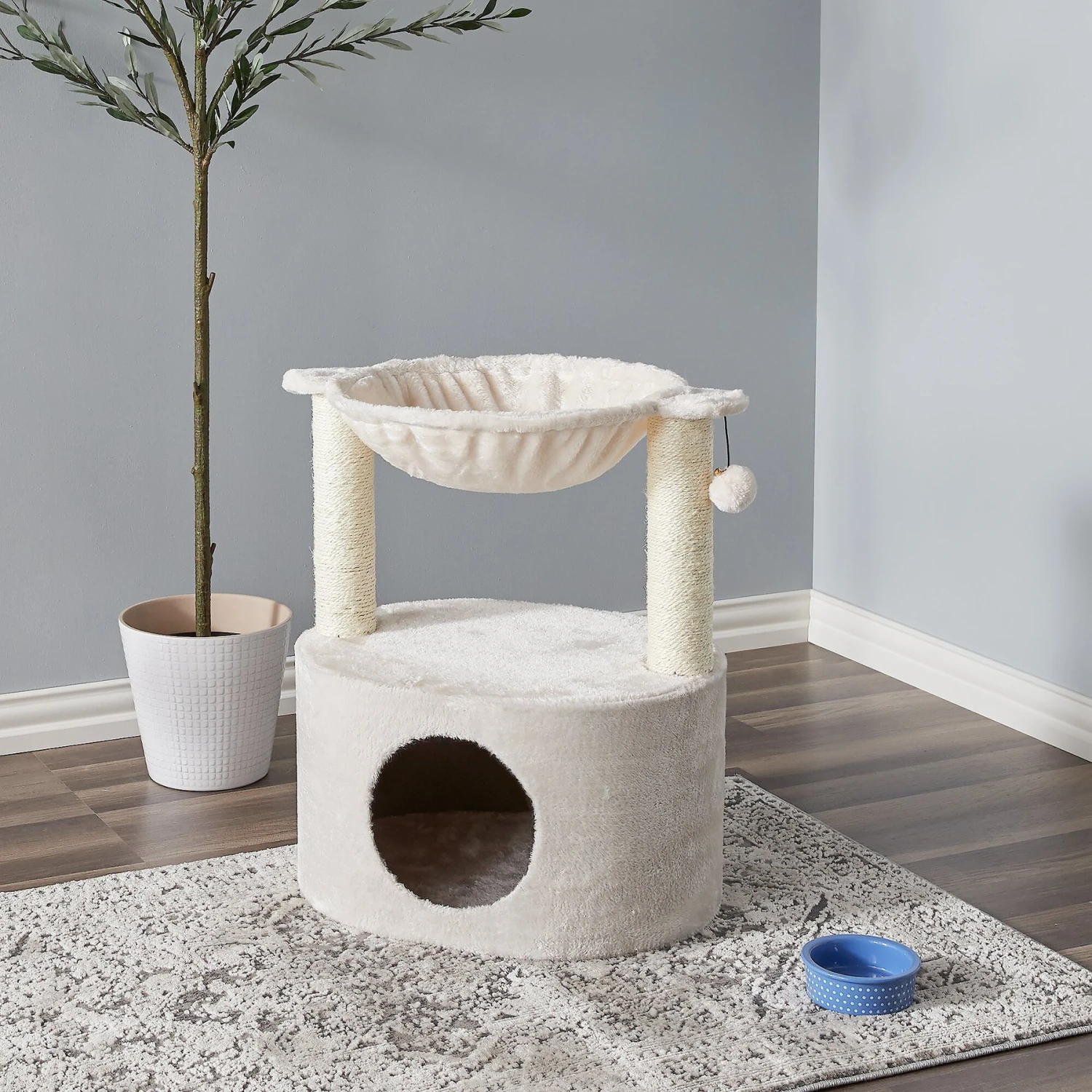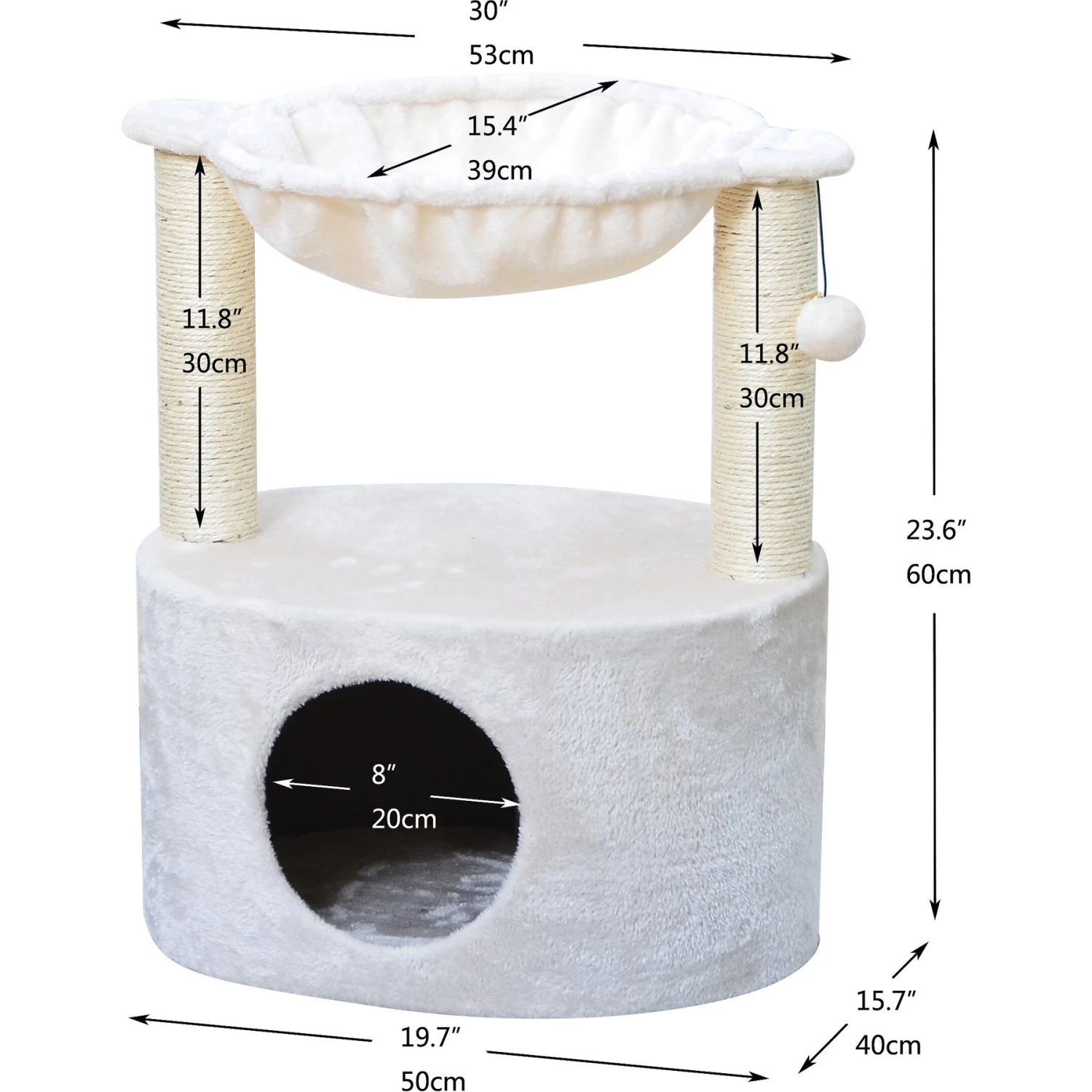 The Two By Two The Holly 23.6-in Plush Cat Tree & Condo is purr-fect for both playtime and nap time. The oval condo base creates a cozy hideaway, while the middle platform is a paw-some place to perch. A plush hammock on the top is sure to become your furbaby’s favorite cat nap spot. This cat tree is ready for playtime, too––an attached ball and sisal-wrapped columns help to keep kitty’s claws occupied. The condo takes up minimal floor space and its neutral color matches home decor, so it’s ideal for apartments and condos as well as larger homes.