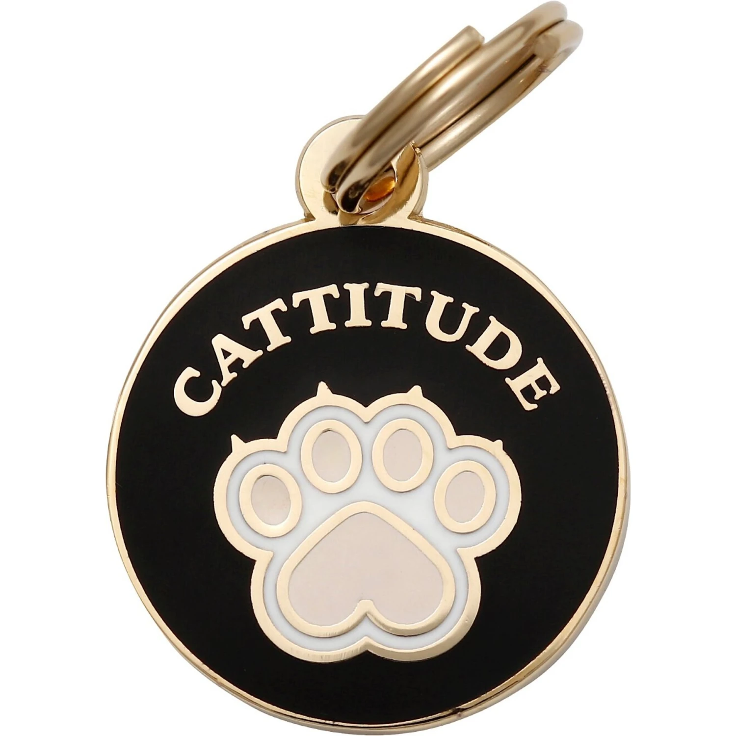 Turn up the cattitude with the Two Tails Pet Company Cattitude Cat ID Tag. Made especially for kitties, this cool collar ID charm is a simple way to help keep your BFF safe and stylish. The lightweight tag can be customized with up to three lines of text on the back, and the long-lasting laser-engraving ensures your furry friend’s vital ID information will never rub off. Plus, the brass tag with your gold plating makes sure your furever friend’s true cattitude shines through.