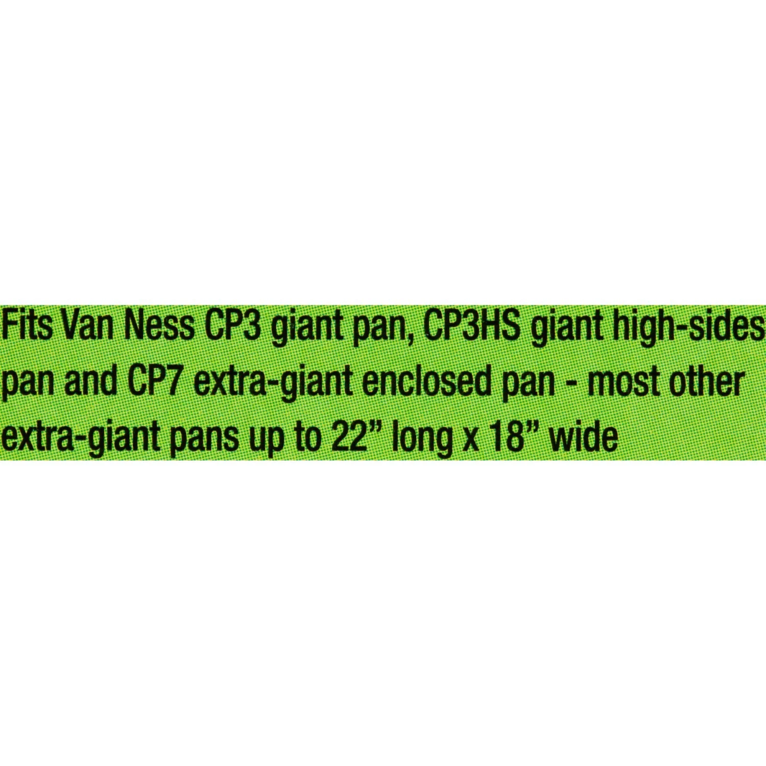 Fits Van Ness CP3 giant pan, CP3HS giant high-sides pan and CP7 extra-giant enclosed pan and- most other extra-giant pans up to 22 x 18 inches. Simply remove the bag and pull the drawstring for fast and easy disposal!