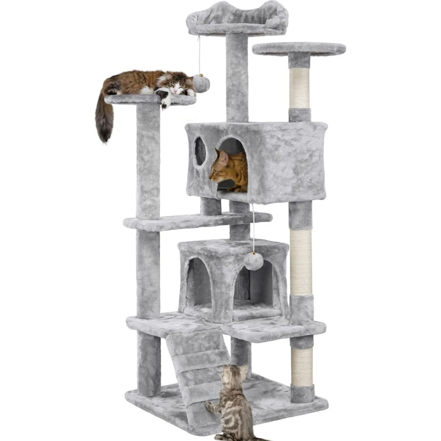 - Features two enclosed condos with doors and windows so that your kitties can have a hiding spot.