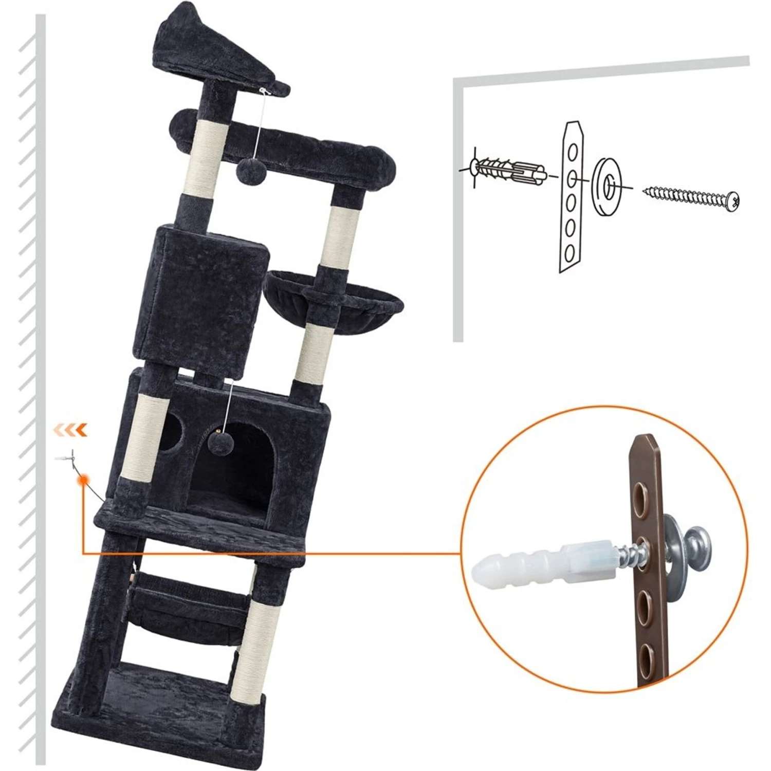 - Includes two platforms, a basket, two condos with windows, six scratching posts and two furry balls.